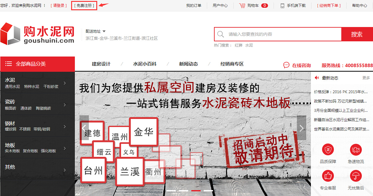 1. 打開購水泥網(wǎng)首頁,在右上方,點擊“免費注冊”按鈕;