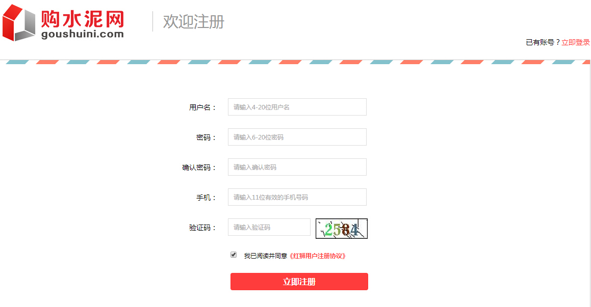 若您還沒有購水泥網(wǎng)賬號,請點擊注冊,詳細操作步驟如下:
